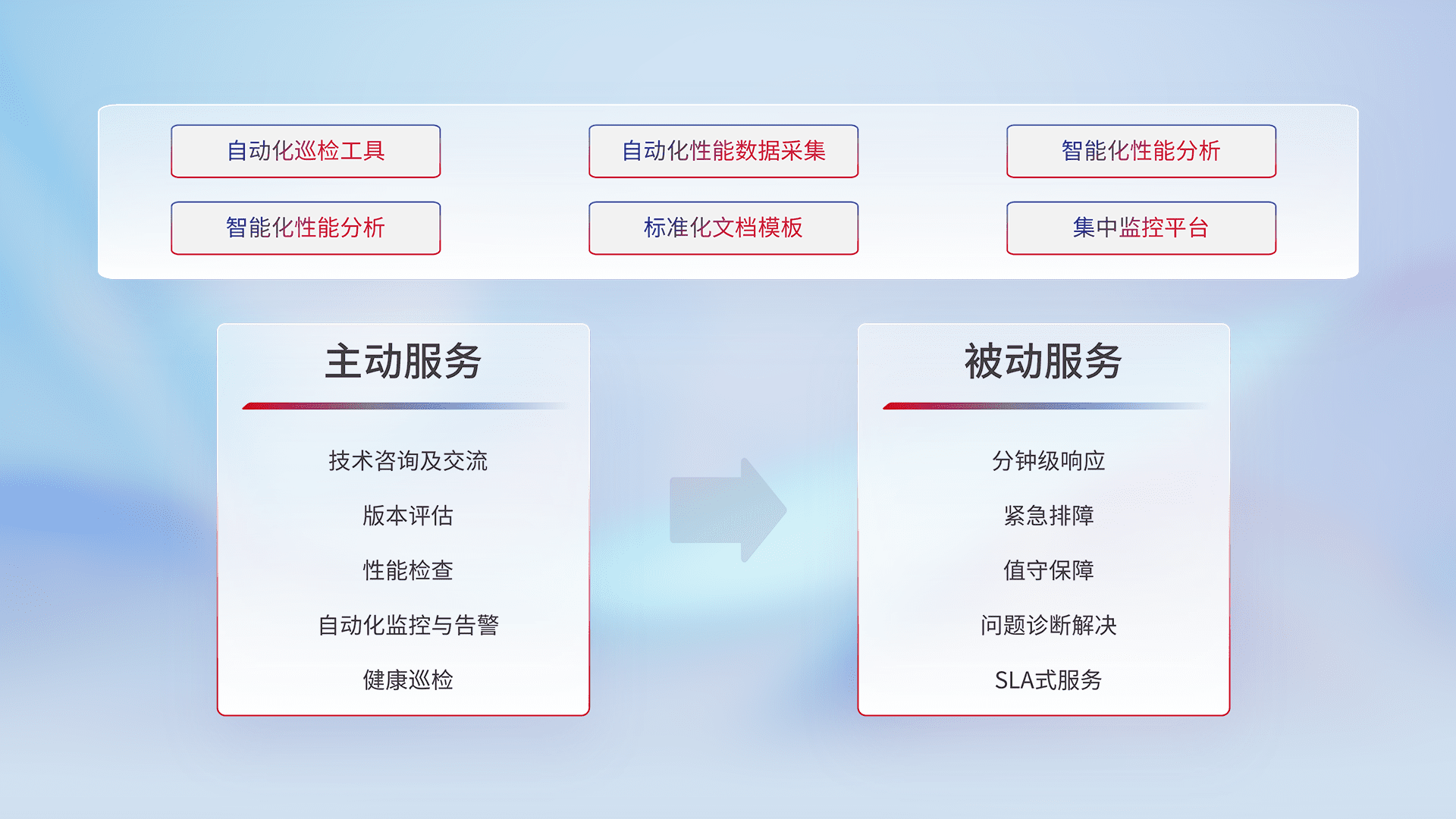 智能化工具和标准化文档,,,,保障服务质量,,,,提供主动服务(包含技术咨询、、版本评估、、性能检查、、自动化监控与告警、、、健康巡检)和被动服务包含(分钟级响应、、、紧急排障、、、、值守保障、、、问题诊断解决、、、SLA服务)。。。